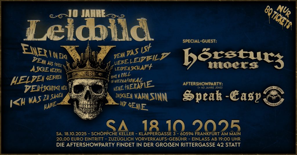 - Anmerkungen: 10 Jahre Leidbild – Jubiläumskonzert in Frankfurt! Am 18. Oktober 2025 feiern wir ein ganz besonderes Kapitel unserer Bandgeschichte: 10 Jahre Leidbild! Im legendären Schöppche Keller Frankfurt erwarten euch ein einmaliges Konzert, eine besondere Setlist und ein Abend, den wir so schnell nicht vergessen werden. Als Support sind unsere Freunde von Hörsturz Moers mit am Start – geballte Energie von Anfang an! Und weil Feiern zum Jubiläum dazugehört, geht’s danach weiter mit der offiziellen Aftershow Party im Speak Easy Frankfurt. An diesem Abend stoßen wir auch auf 40 Jahre Jens an – doppelter Grund zum Feiern! 🎉 ⚠️ Achtung: Es gibt nur 80 Tickets – wer dabei sein will, sollte schnell zuschlagen! *Verkauf: ab Donnerstag, den 28.08. – 18 Uhr!* 📅 18.10.2025 ⏰ Einlass 19:00 Uhr 📍 Schöppche Keller, Frankfurt 🎶 Aftershow im Speak Easy