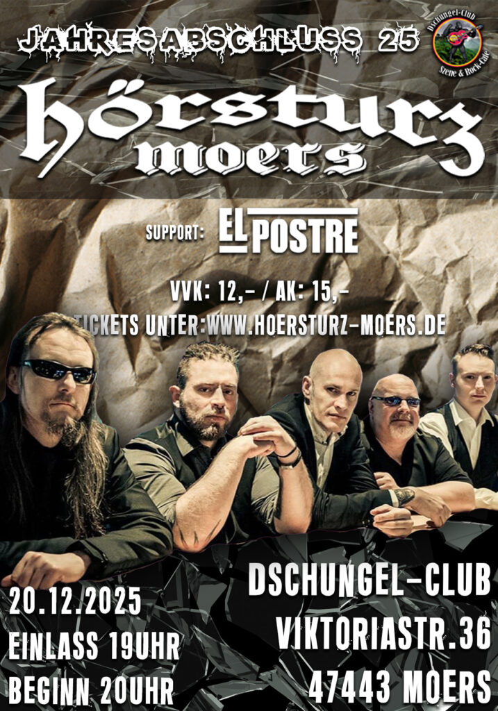 Artist: Hörsturz Moers Datum: 20.12.2025 Zeit: 19:00 Location: Dschungel-Club Stadt: Moers , NRW Adresse: Viktoria Straße 259 Land: Germany Eintritt: VVK 12 € / AK 15 € Altersbeschränkungen: All Ages zu Google Kalender hinzufügen|iCal herunterladen
